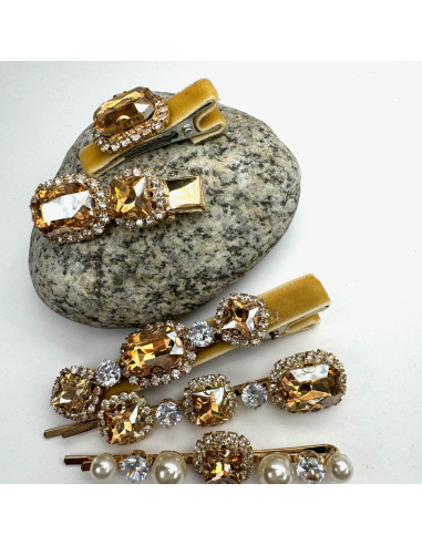 Zestaw 5 sztuk SPINKA z AKSAMITKĄ, WSUWKA z KRYSZTAŁKAMI CYRKONIE ŻÓŁTY